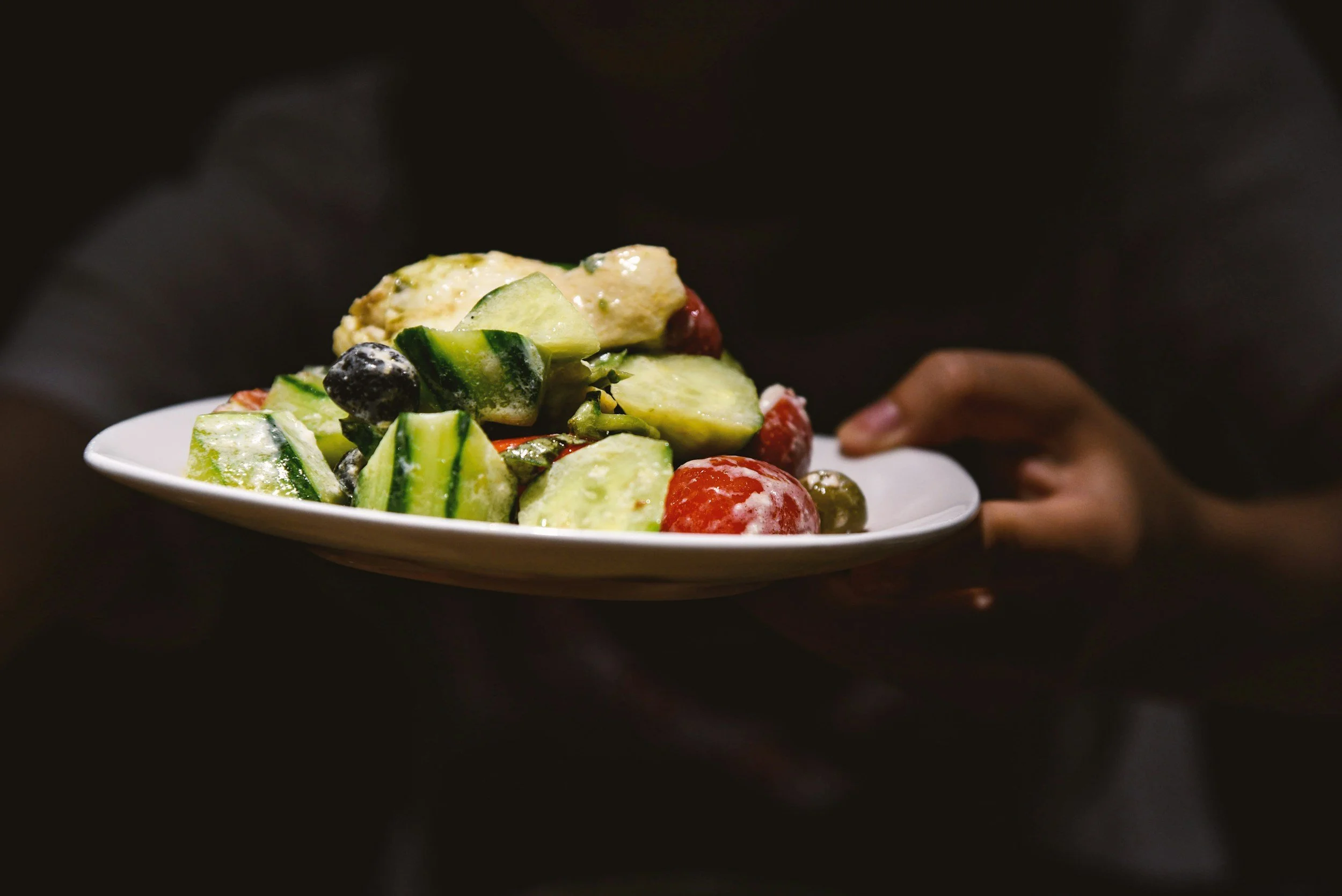Vihersalaattia, aurinkokuivattua tomaattia, latva-artisokan sydäntä, tomaattia.
